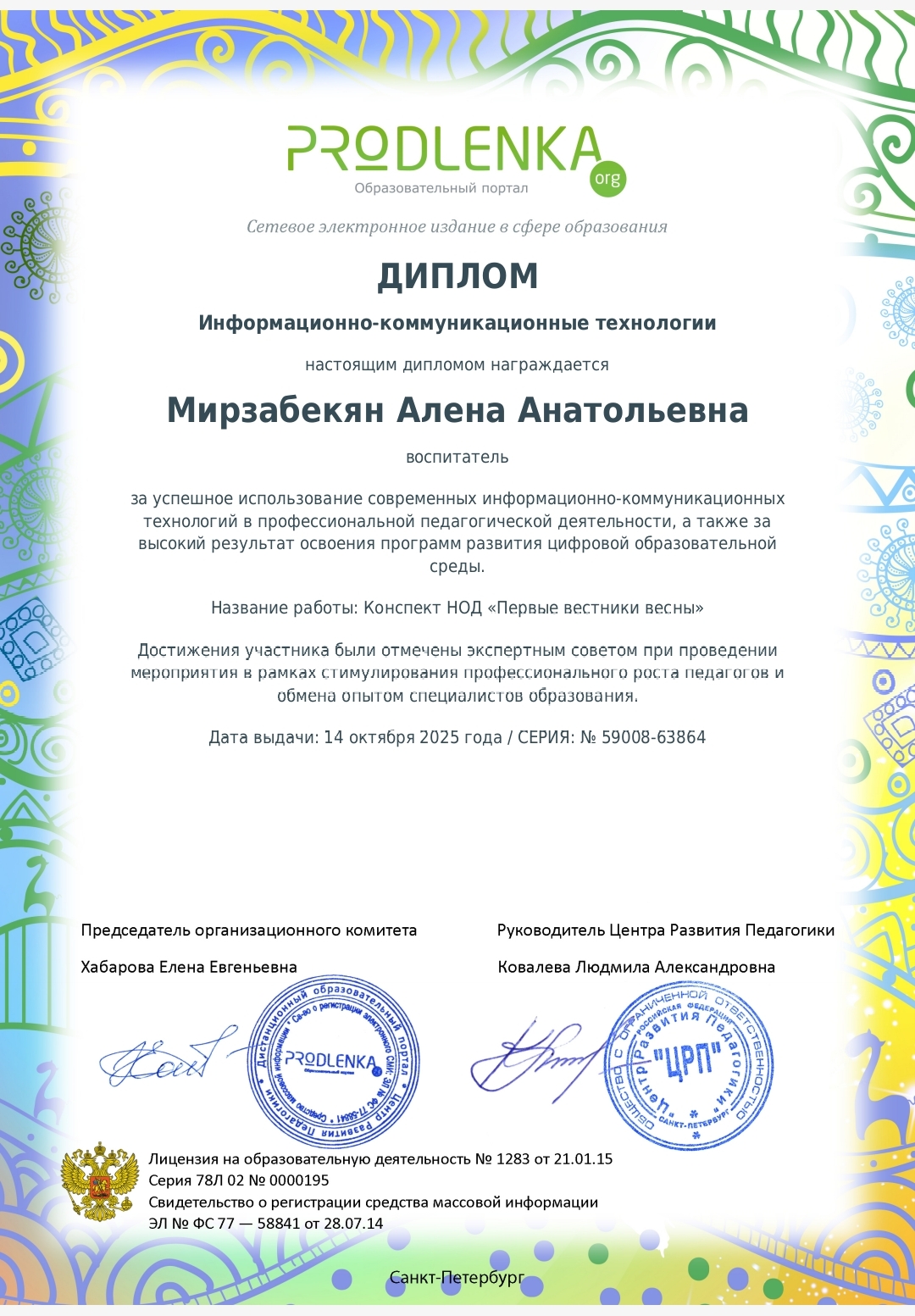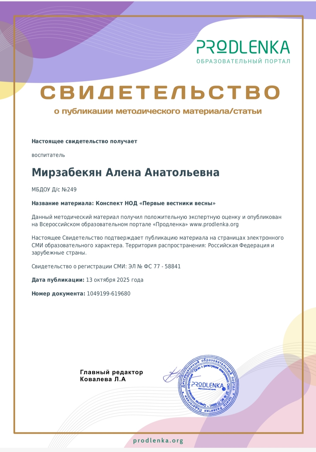 Свидетельство о публикации методического материала "Первые вестники весны". Октябрь 2025г.
