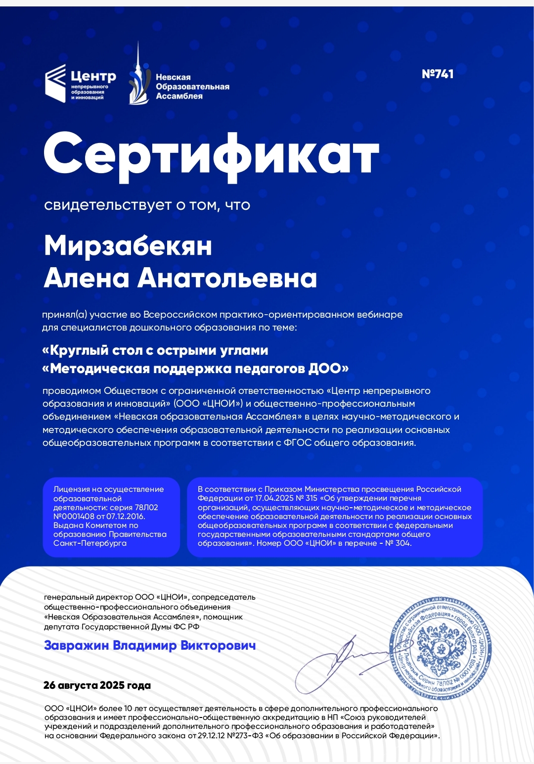 Сертификат. Участие в вебинаре "Круглый стол с острыми углами". Сентябрь 2025г.