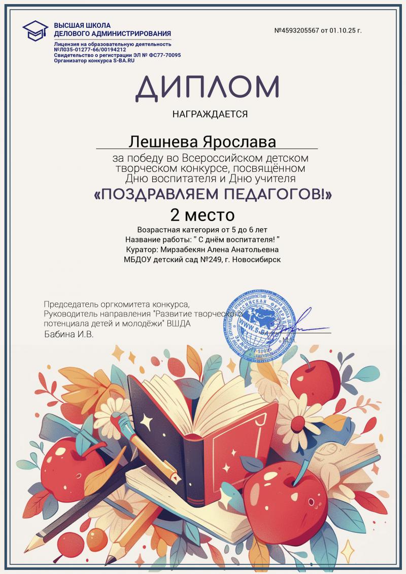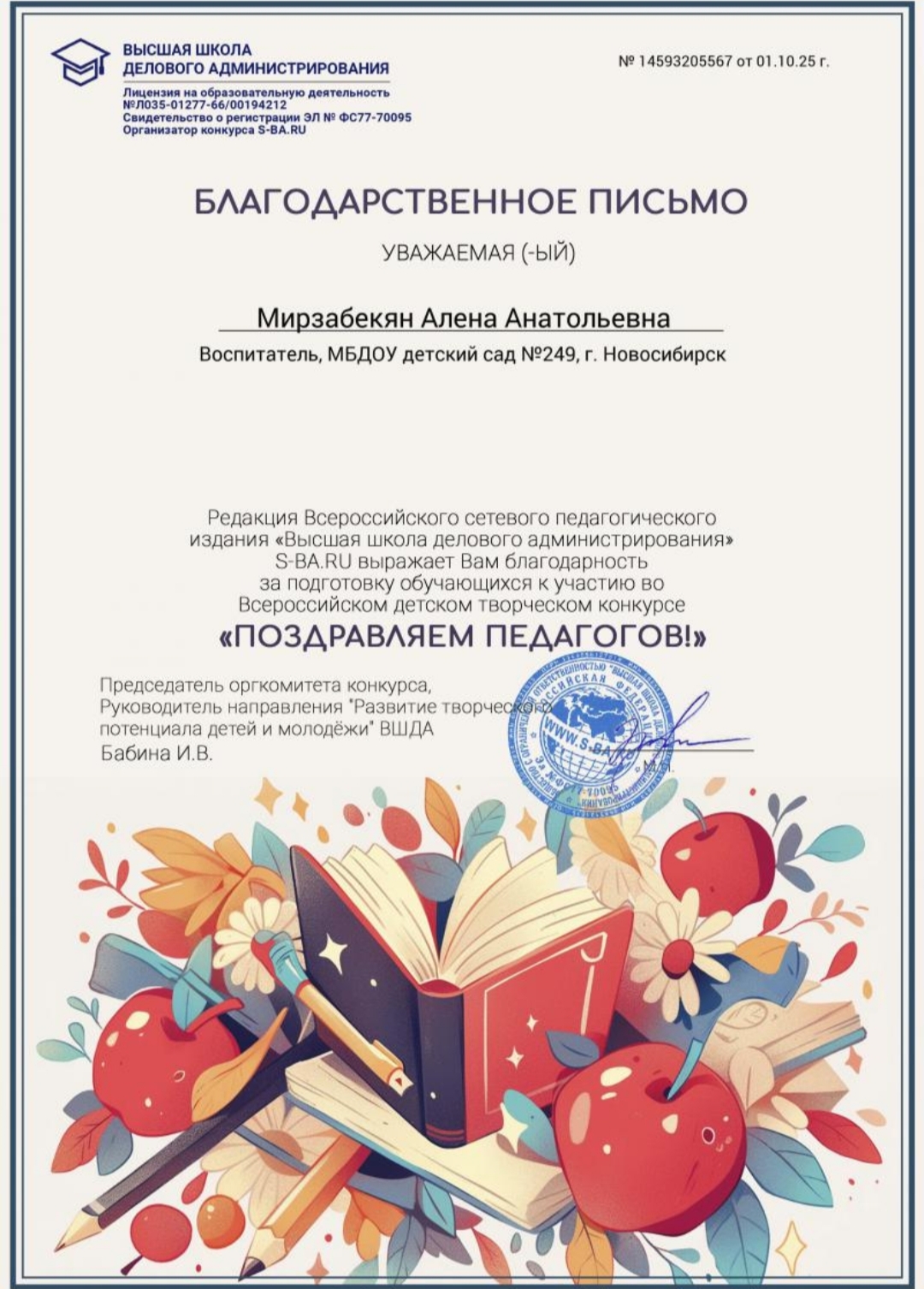 Благодарственное письмо за подготовку к участию во Всероссийском детском творческом конкурсе "Поздравляем педагогов". 01.10.2025г.