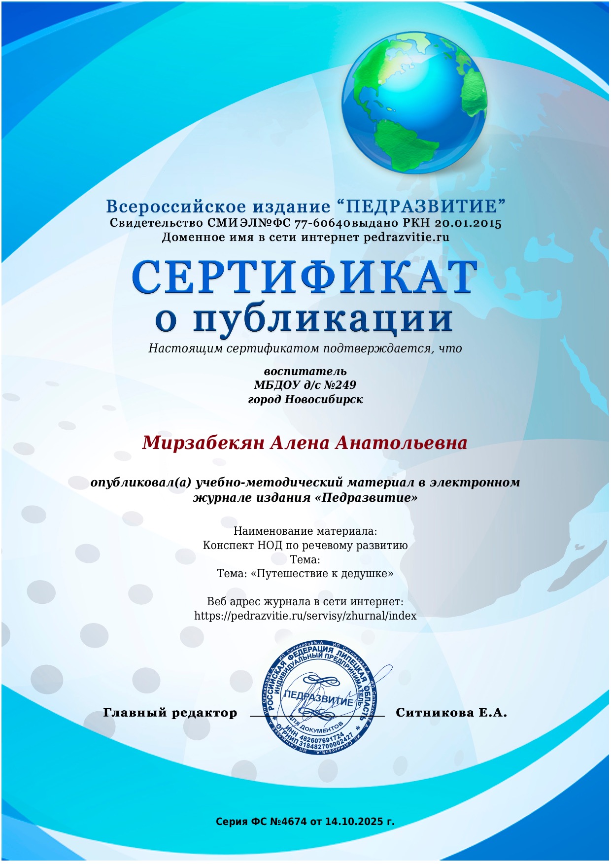 Сертификат о публикации во Всероссийском журнале издания "Педразвитие". "Путешествие к дедушке". Октябрь 2025г.
