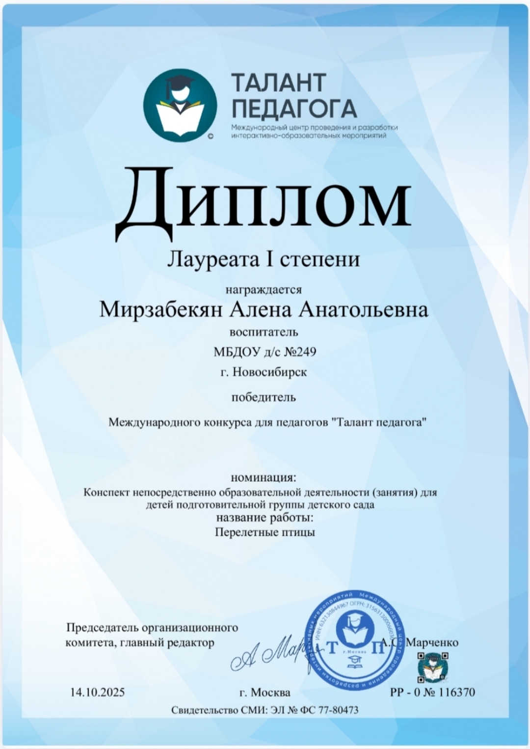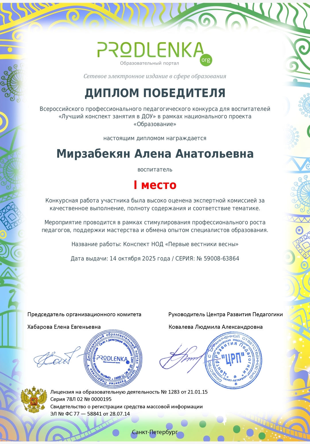 Диплом победителя, 1 место, всероссийского профессионального педагогического конкурса. Лучший конспект занятия ДОУ. Октябрь 2025г.